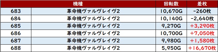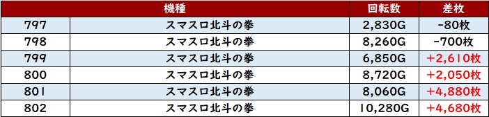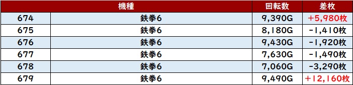 6台中5台が回転数8,800G超え且つ差枚数+4,500枚超えと、持ち前のポテンシャルを存分に発揮していた!
