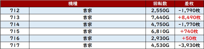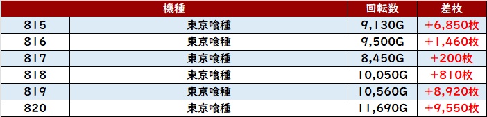 続いて「東京喰種 815~820」が半数が差枚数+6,800枚超えと、破壊力抜群の出玉感を記録!