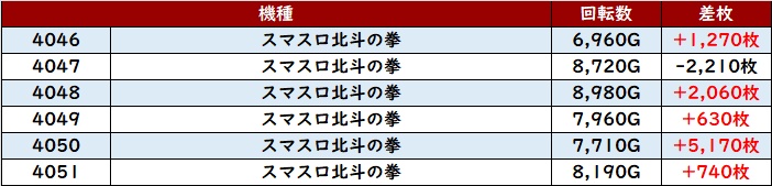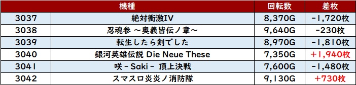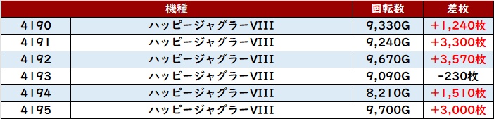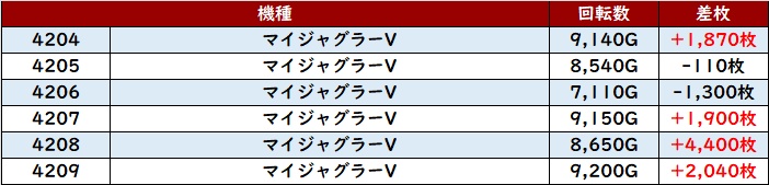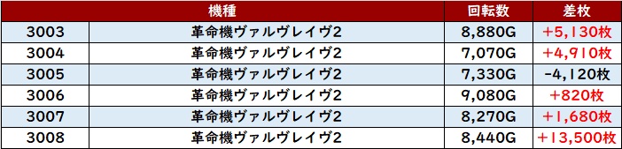 続いて「ヴヴヴ2 3003~3008」も6台中5台がプラス差枚と良好な出玉感を記録!