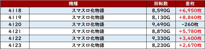 まずは「スマスロ化物語 4118~4123」が全台回転数8,100G超えと、素晴らしい盛り上がりに!