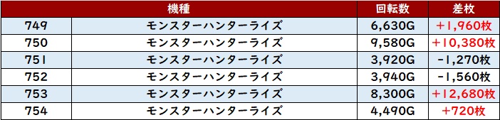 まずは「モンハンライズ 749~754」が強烈な出玉感で、盛り上がりを牽引!