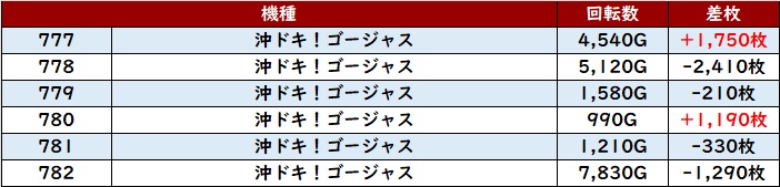 回転数1万G超えや差枚数+1万枚超えが複数台見られ、人気機種らしい熱狂ぶりが見られた。