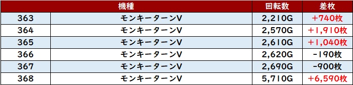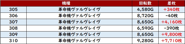 まずは「ヴヴヴ 305~310、332~337」が差枚数+1万枚超えを含んで、驚愕の出玉感に!