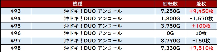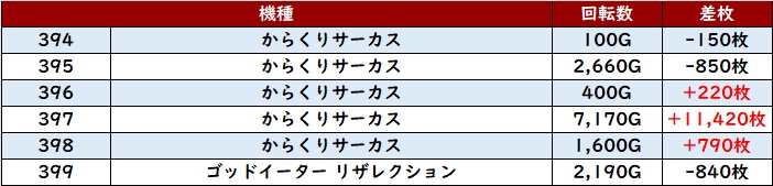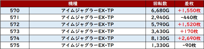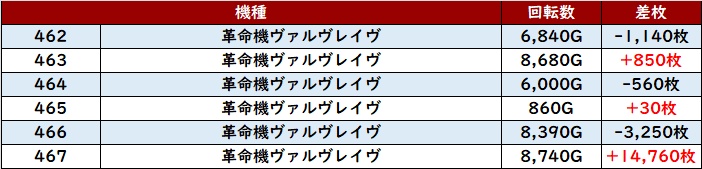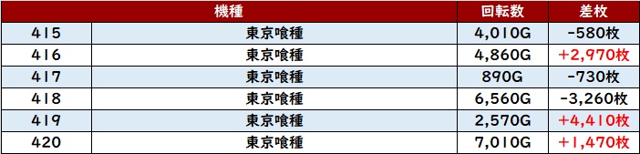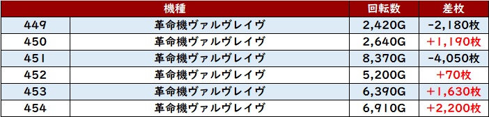 回転数7,010Gなど賑わいを見せ、差枚数+4,410枚を筆頭に良好な出玉感が散見された。