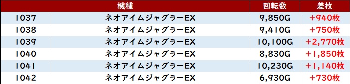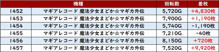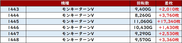 まずは「モンキー5 1443~1448」が差枚数+17,340枚を筆頭に全台大幅プラス差枚を記録!