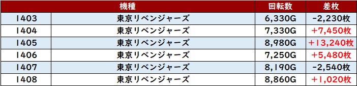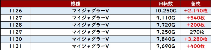 差枚数+1万枚超えが2台現れ、その他の台も大きく出玉感を伸ばしていた。
