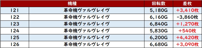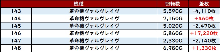 こちらも6台中5台が差枚数+3,000枚以上の優秀な出玉感で、熱狂的な盛り上がりとなった。