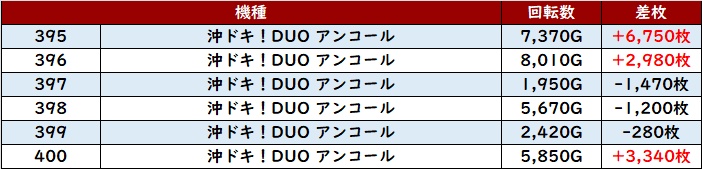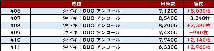 中でも「沖ドキDUO2 406~411」6台中5台がプラス差枚に加えて差枚数+8,030枚も見られる程の勢いが見られた!