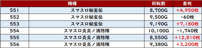 続いて「スマスロ秘宝伝~スマスロ炎炎 551~556」が機種を跨いで素晴らしい活躍ぶりに!