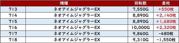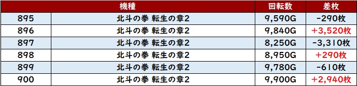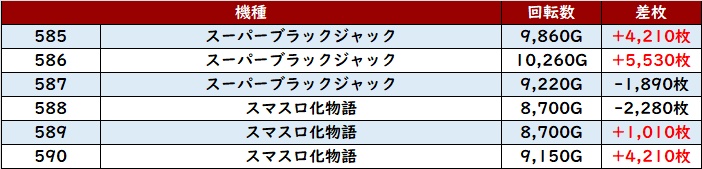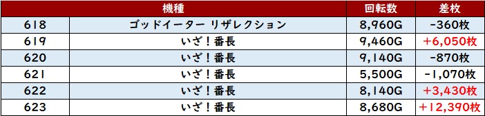こちらも回転数8,500G超えとどの台もぶん回されており、差枚数+12,810枚を先頭に抜群の出玉感を魅せた。