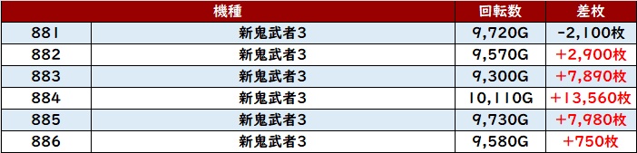 まずは「新鬼武者3 881~886」が強烈な出玉感で盛り上がりの筆頭に!