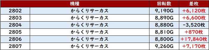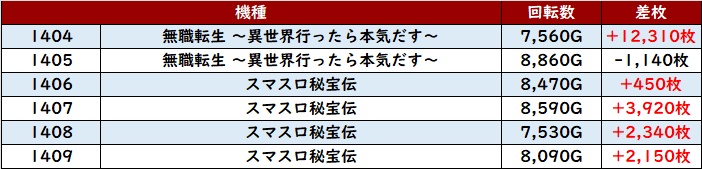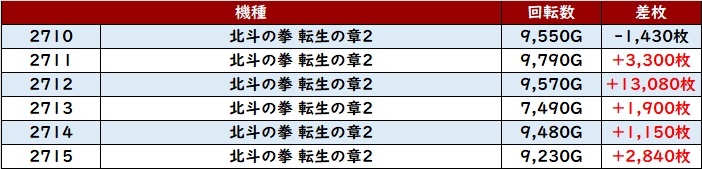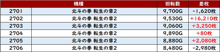 続いて「北斗転生2 2701~2706、2710~2715」が12台中9台がプラス差枚に!