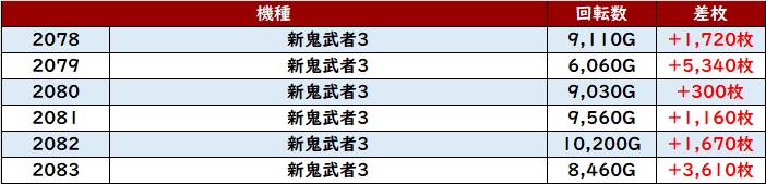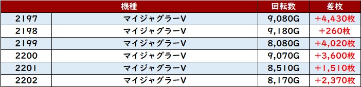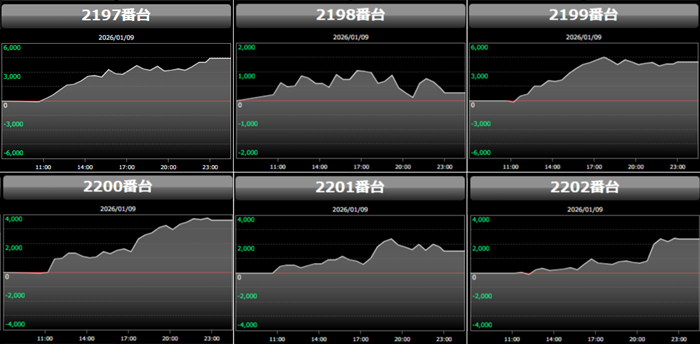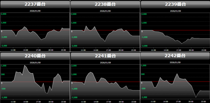 6台中5台が回転数9,000G超え&大幅プラス差枚と絶好調で、店内の盛り上がりを牽引する存在となった!