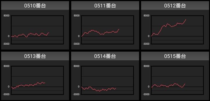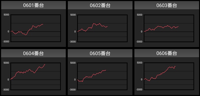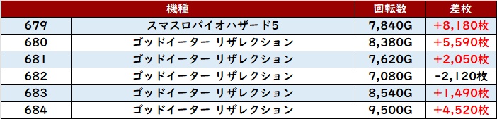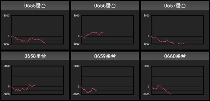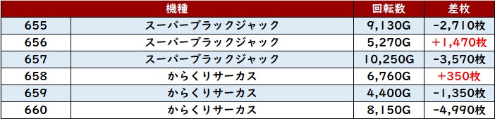 また「スーパーブラックジャック~からくりサーカス 655~660」に関しても、マイナス差枚にもかかわらず回転数9,100G超えとぶん回されている台が複数あり、粘る価値が非常にある状況だったことを匂わせていた。
