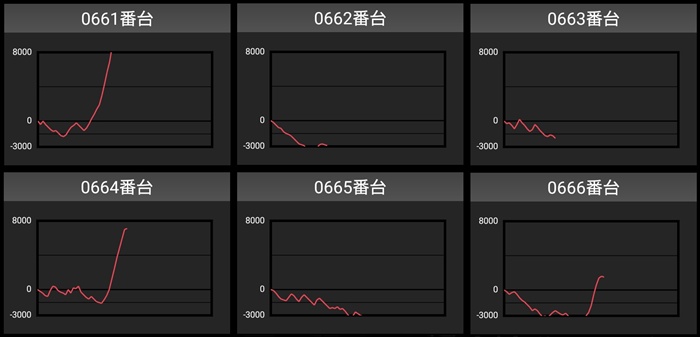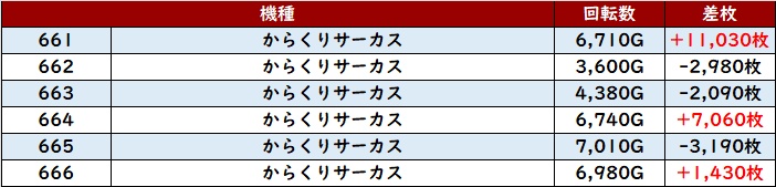 続いて「からくりサーカス 661~666」から差枚数+7,000枚超えと凄まじい出玉感の台を2台目撃!