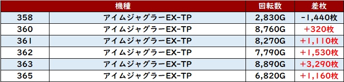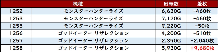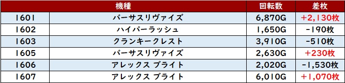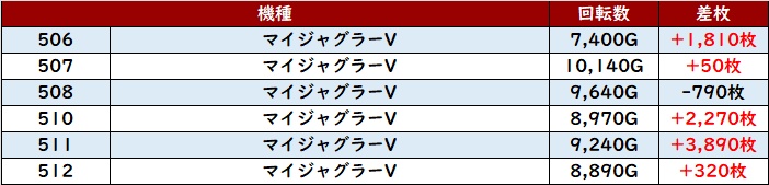 回転数7,200G以上且つ差枚数+2,400枚超えの台が複数見受けられ、稼働が上がれば更なる出玉感に期待ができそうなポテンシャルの高さを感じられた。
