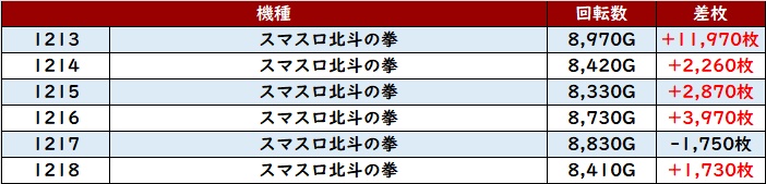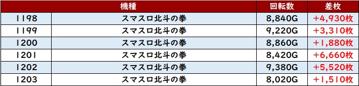 まずは「スマスロ北斗 1198~1203、1213~1218」12台中11台が大幅プラス差枚と絶好調!