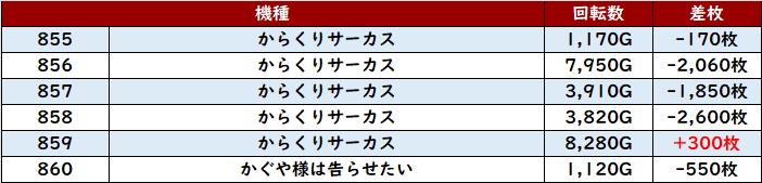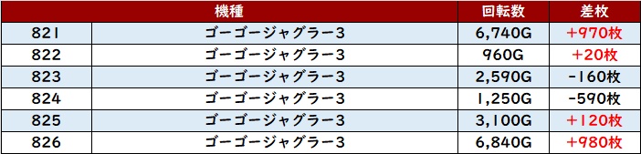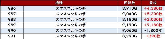 まずは「スマスロ北斗 986~991」が6台中5台がプラス差枚と絶好調!