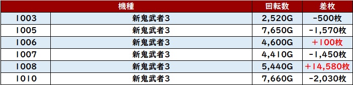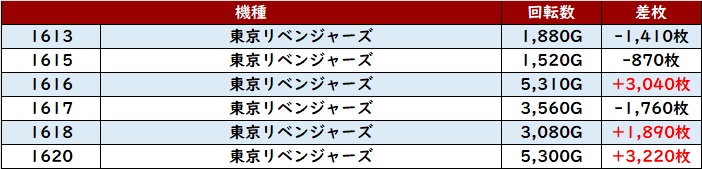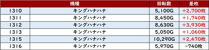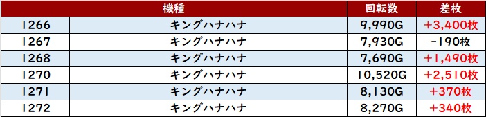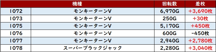 また「モンキー5~スーパーブラックジャック 1072~1078」が、半数が差枚数+2,700枚超えと存在感を発揮!
