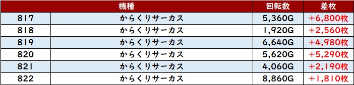 まずは「からくりサーカス 817~822」が力強い出玉感のオンパレードに!