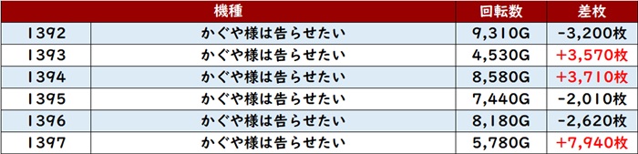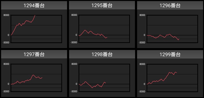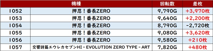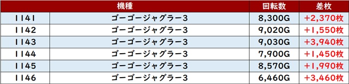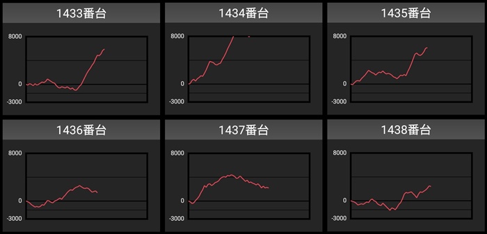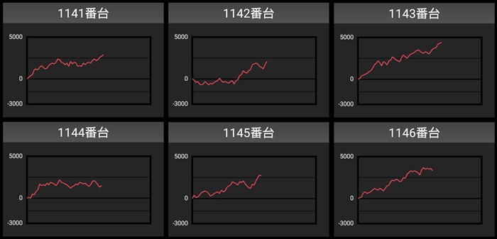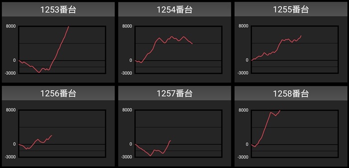 差枚数+10,100枚の台を筆頭に全台が大幅プラス差枚となり、盛り上がりを後押ししていた。