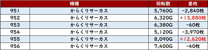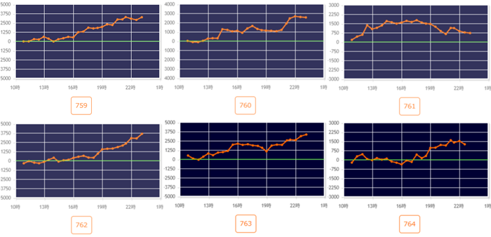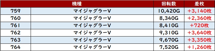 続いて「マイジャグ5 759~764」が全台回転数7,500G超え&プラス差枚を記録!