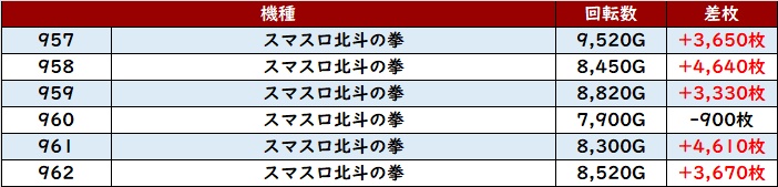 まずは「スマスロ北斗 957~962」がメイン機種らしい活気に溢れた一角に!
