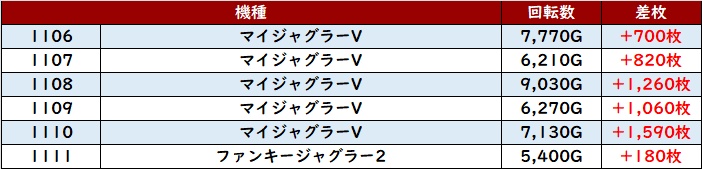 続いて「マイジャグ5~ファンキー2 1106~1111」が機種を跨いで盛況!
