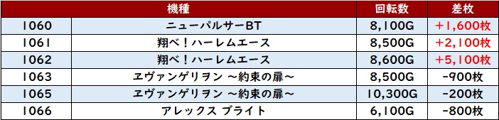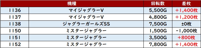 全台回転数8,900G超えの高い稼働を伴い、差枚数+6,400枚を筆頭に大半が差枚数+3,000枚以上を記録し、盛り上がりの主役となった!