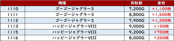 続いて「ゴージャグ3~ハッピー3 1110~1116」が好調さを発揮!