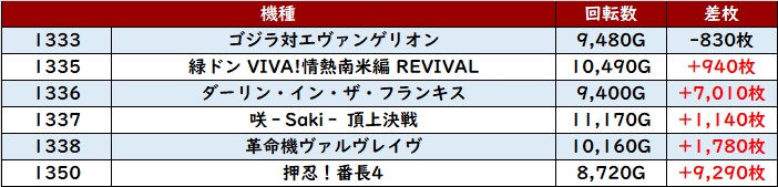 殆どが差枚数+4,300枚超えに加え回転数9,100G超えと、文句の付けようがない数値を記録し輝かしいほどの存在感を放っていた!