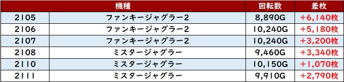 続いて「ファンキー2~ミスター 2105~2111」が全台回転数8,800G超え且つ大幅プラス差枚と、称賛すべき結果に!