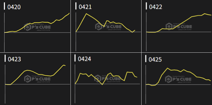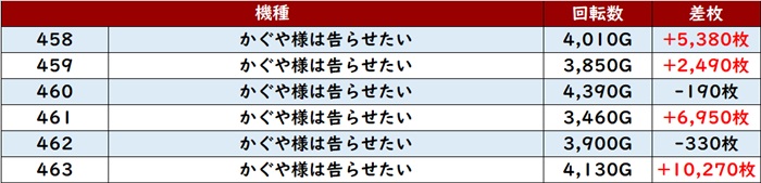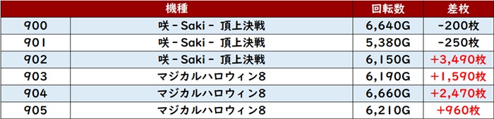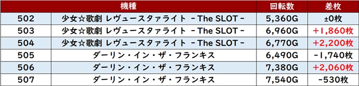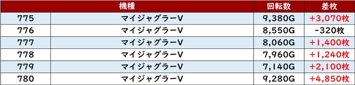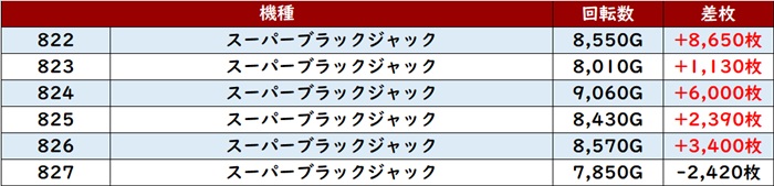 稼働の高さも相まって6台中5台が大幅プラス差枚となっており、中には差枚数+9,030枚と大台にまであと一息という台まで確認できた。