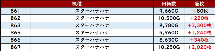 まずは「スタハナ 861~867」が回転数1万G超えが見られる程の高稼働に!