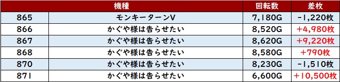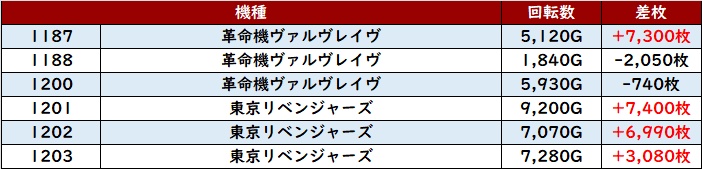 半数以上が回転数8,200G超えの稼働に加え、中には差枚数+10,500枚と非の打ち所がない出玉感も見られる程の熱狂ぶりとなった!