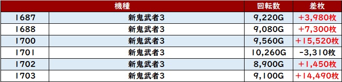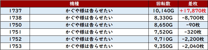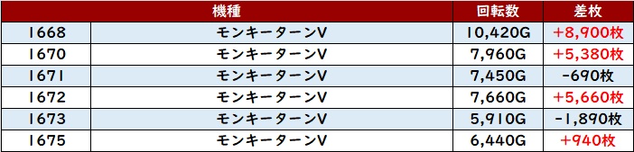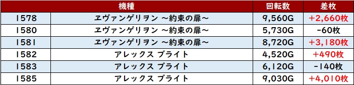 新台と言うこともあり全台回転数8,900G以上の文句なしの稼働、そして2台が差枚数+1.4万枚超えを叩き出す快挙を成し遂げた!