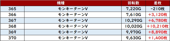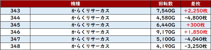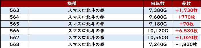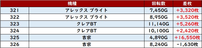 6台中5台が大幅プラス差枚を記録したうえ、中には差枚数+10,210枚と凄まじい出玉感となる台も見られ、ユーザー達の満足度も高かったことだろう。