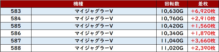 まずは「マイジャグ5 583~588」が驚愕の差枚数+6,920枚を筆頭に、全台大幅プラス差枚と圧巻の光景に!
