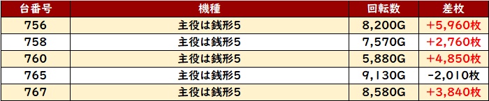 ピックアップした台からは回転数9,130Gや差枚数+5,960枚といった数字が見られ、状況の良さは明白であった。