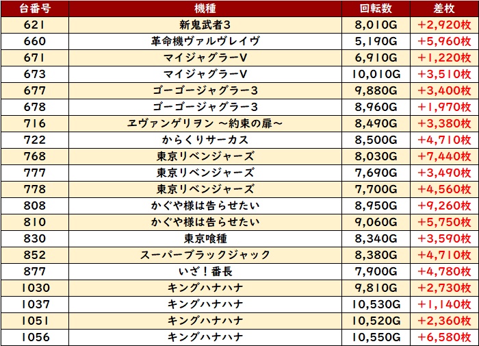 その他好調台についてもAタイプの「キンハナ」から、回転数10,550G且つ差枚数+6,580枚とAT/ART機をも凌駕する勢いを見せる台が現れるなど、タイプ問わず各所から好調台が続出した!