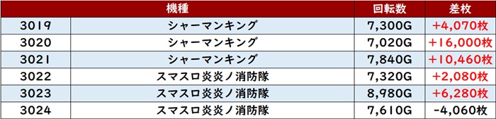 まずは「シャーマンキング~スマスロ炎炎 3019~3024」6台中5台が大幅プラス差枚と絶好調!