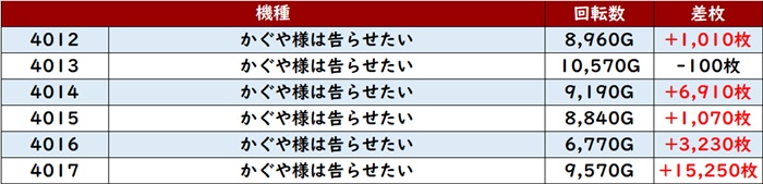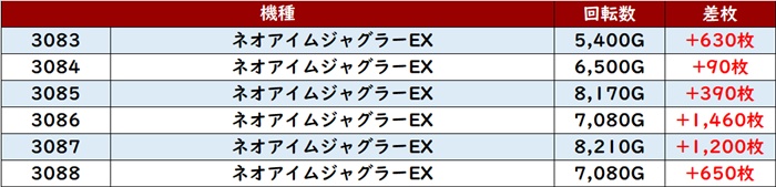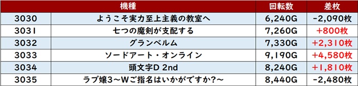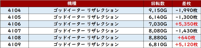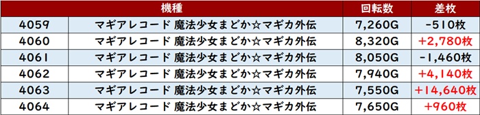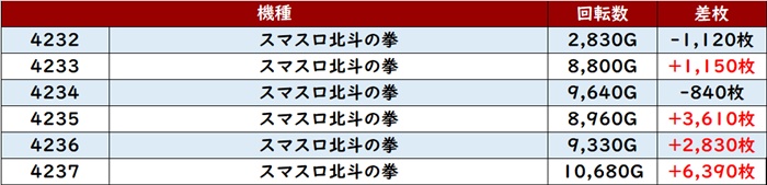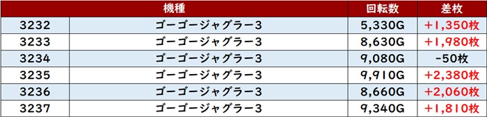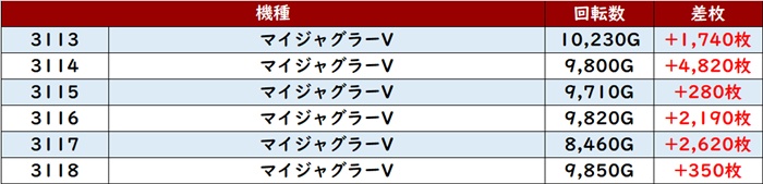 6台中4台が回転数8,100G超え差枚数+2,600枚と誰もが状況の良さを認識するかのような結果を残していた。