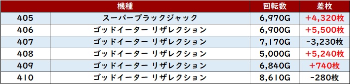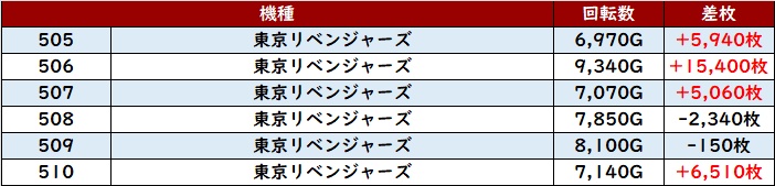 まずは「東京リベンジャーズ 505~510」が大半が差枚数+5,000枚超えという輝かしい出玉感に!