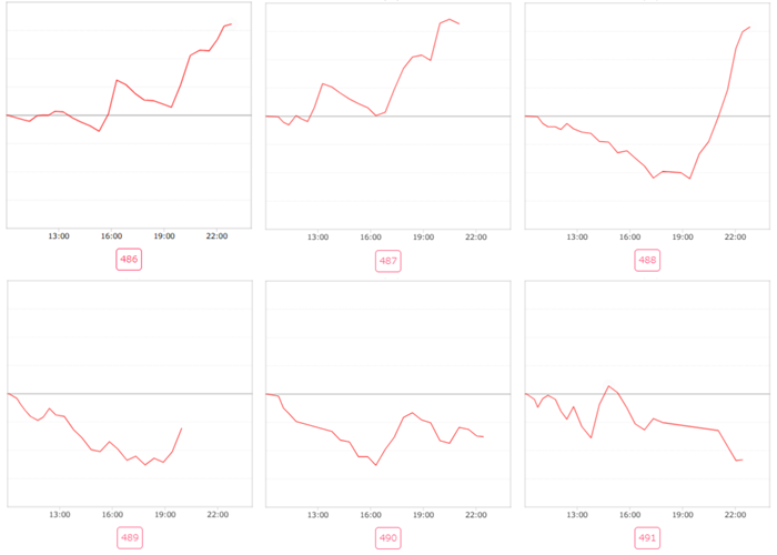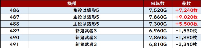 続いて「銭形5~新鬼武者3 486~491」6台中4台が回転数7,300G以上新台らしい賑やかさに!