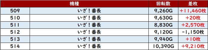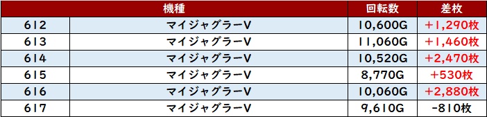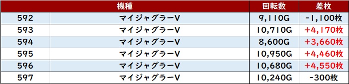 続いて「マイジャグ5 592~597」が全台回転数8,600G以上と素晴らしい稼働の高さに!