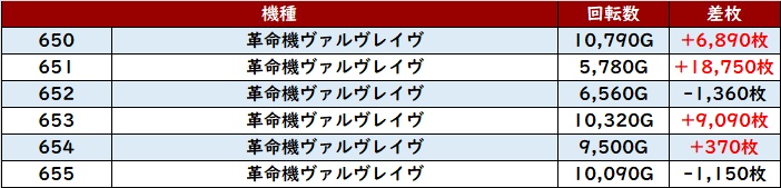 まずは「ヴヴヴ 650~655」の半数が差枚数+6,800枚超えと目を見張る出玉感に!