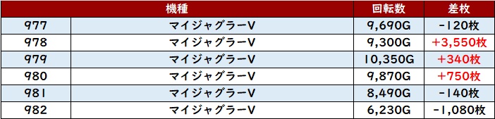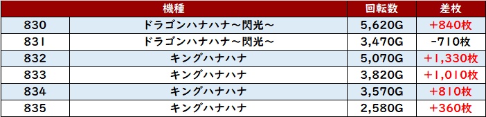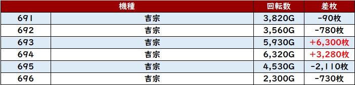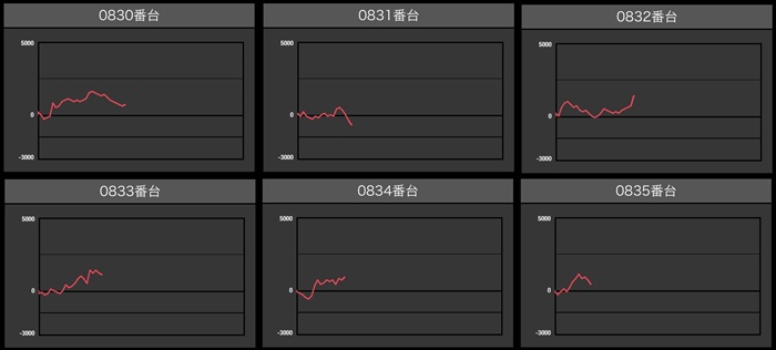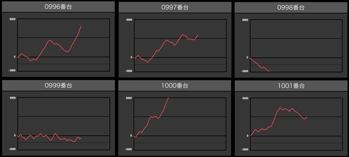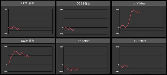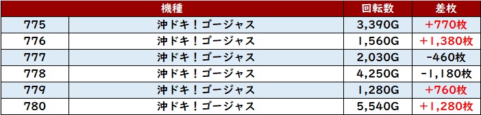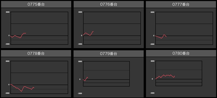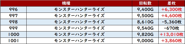 全台回転数8,600G超えの高稼働に加え、差枚数+13,010枚を筆頭に半数以上が差枚数+3,800枚を獲得する素晴らしい結果となった!