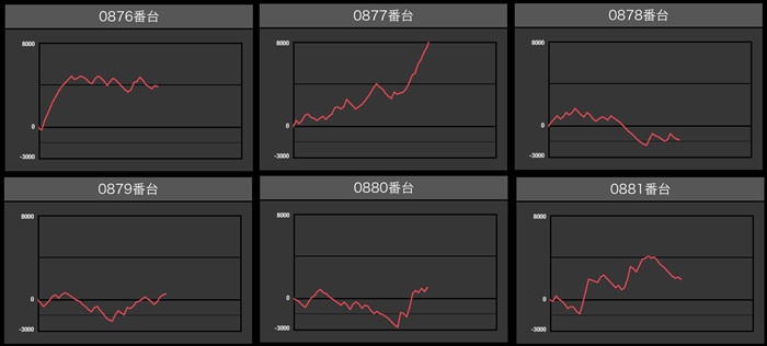続いて「スマスロ炎炎~ヴヴヴ 876~881」回転数1万G超えが散見される程の高稼働に!