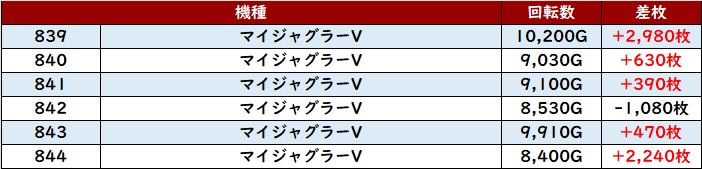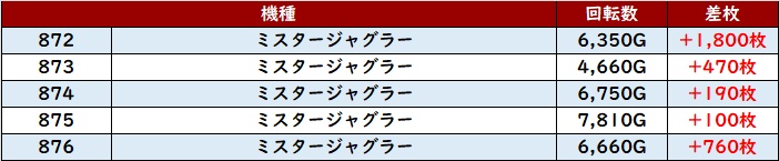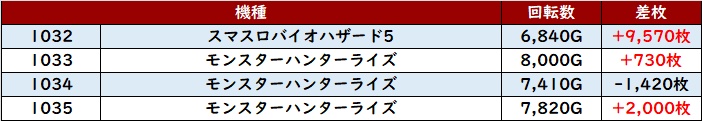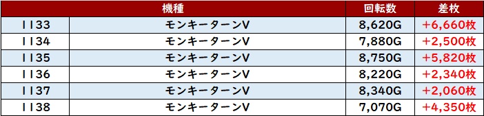まずは「モンキー5 1133~1138」が全台差枚数+2,000枚超えと絶好調!