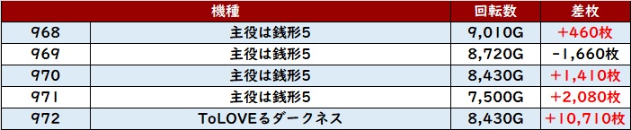 ・1台あたりの平均差玉数:+3,280玉